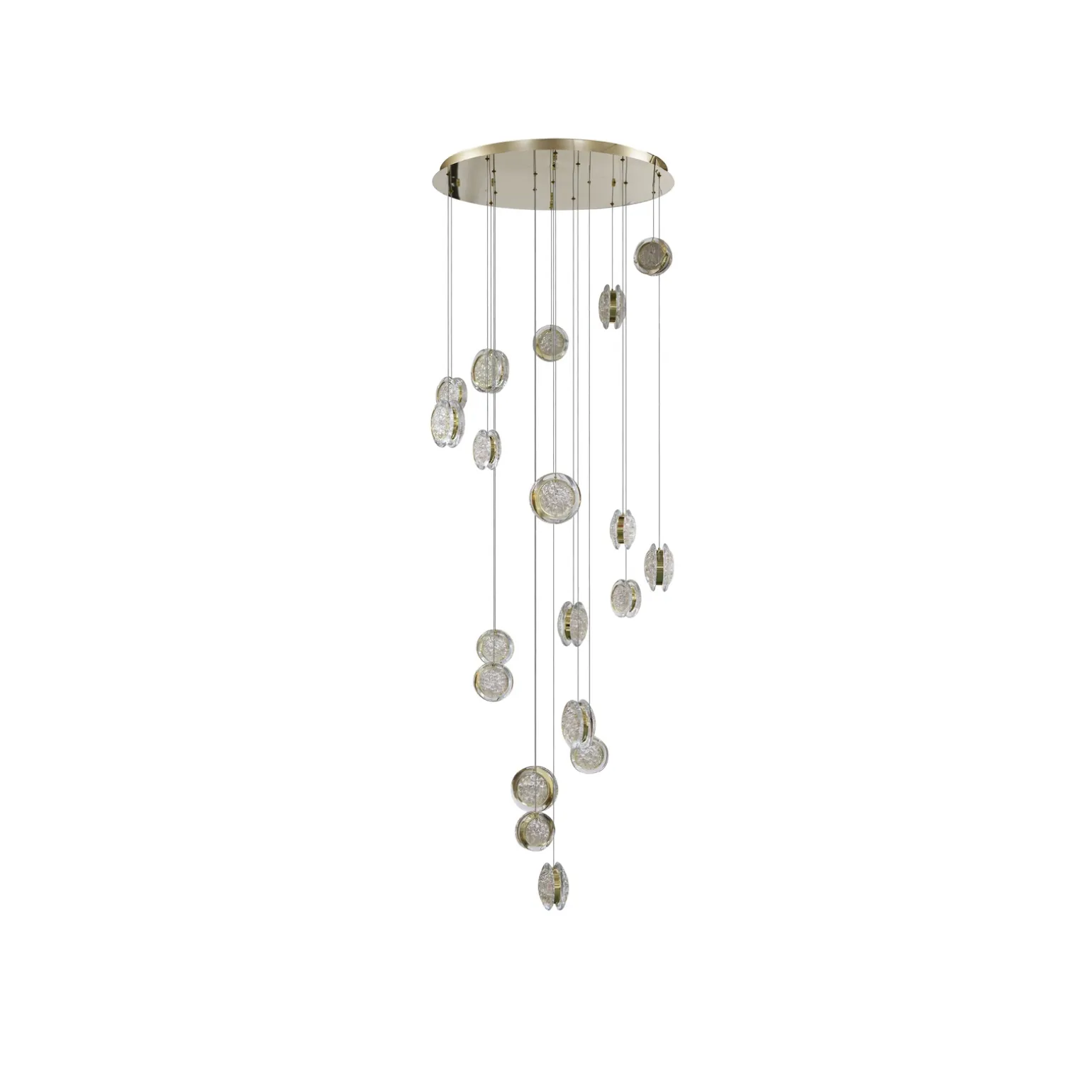 Kaskadowa lampa została wykonana z wysokiej jakości materiałów, takich jak aluminium oraz tworzywo sztuczne. Złote wykończenie w połączeniu z transparentnym kloszem nadaje jej luksusowego charakteru, który idealnie wpisuje się w obecne trendy. Możliwość zastosowania w pomieszczeniach o wysokich sufitach sprawia, że lampa staje się centralnym punktem każdego wnętrza.
