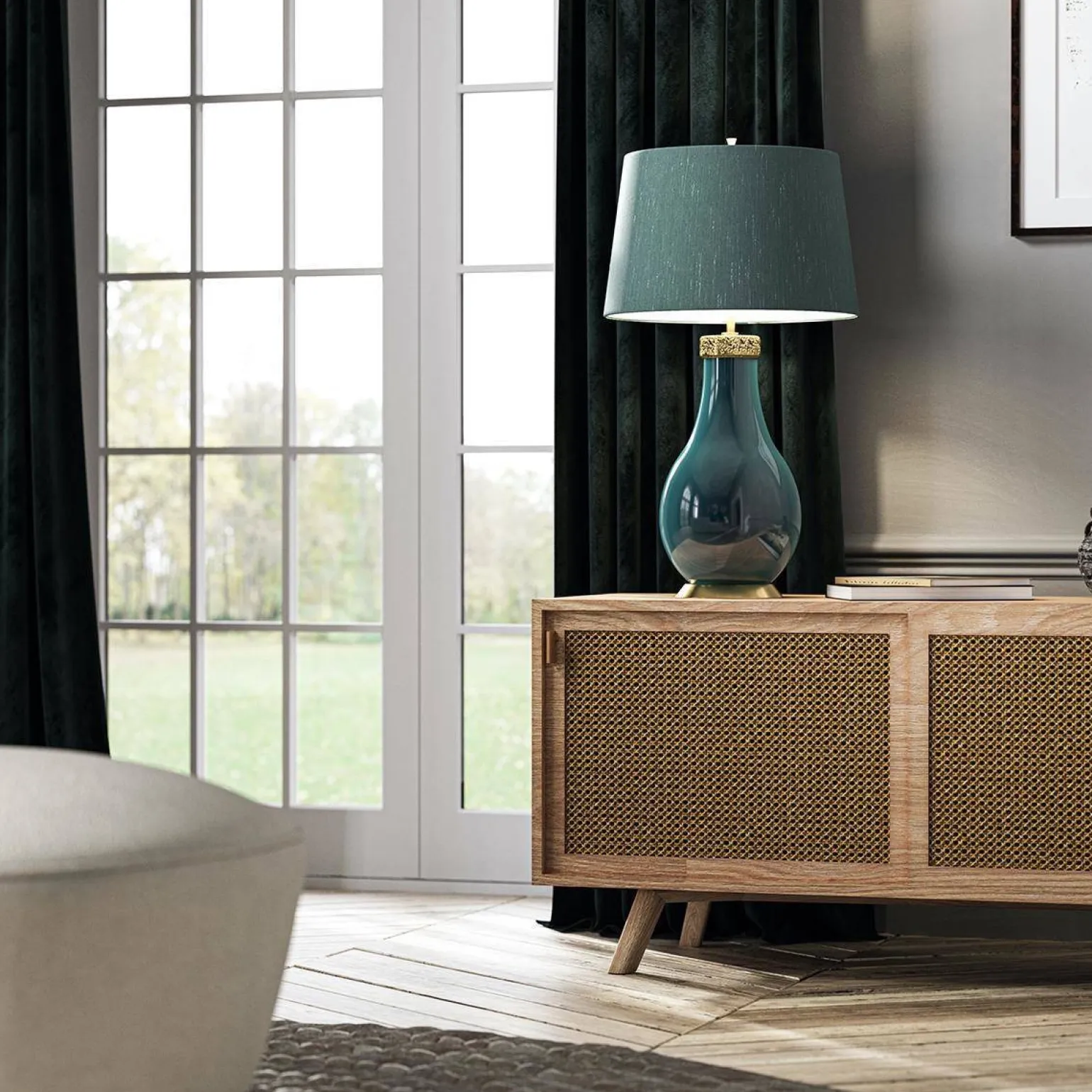 Lampa Havering to połączenie wysokiej jakości materiałów – ceramiki, stali i tkaniny, co sprawia, że jest nie tylko estetyczna, ale również trwała. Kolor jej klosza – w odcieniach zielonym i turkusowym, doskonale współgra z pozostałymi elementami wyposażenia, tworząc spójną i harmonijną aranżację w salonie.