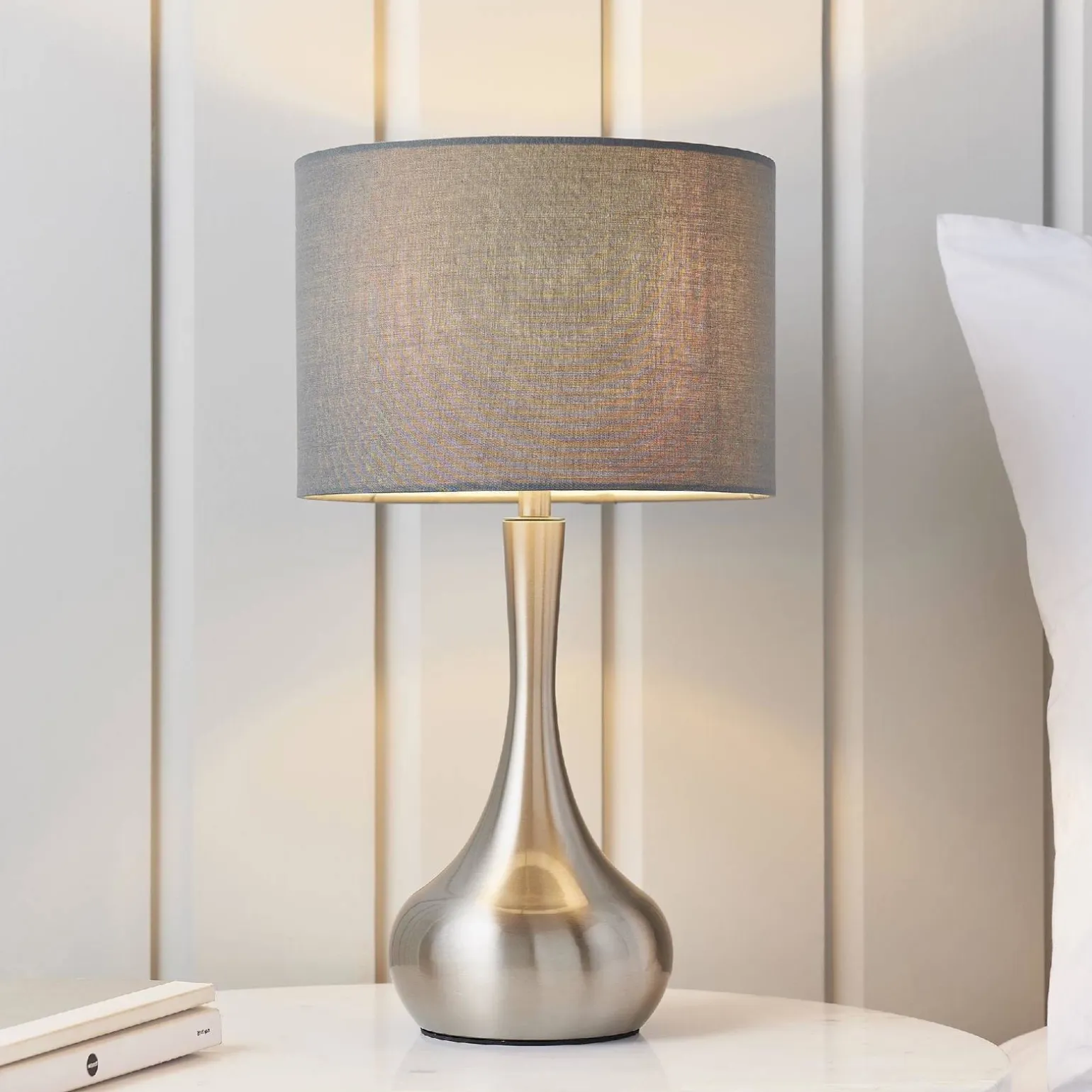 Lampa Piccadilly wyróżnia się swoim niepowtarzalnym wyglądem, dzięki połączeniu satynowej płyty niklowej oraz ciemnoszarej tkaniny. Ten subtelny duet kolorystyczny sprawia, że lampa staje się nie tylko źródłem światła, ale także eleganckim dodatkiem do wystroju. Doskonale będzie prezentować się zarówno na komodzie, jak i przy łóżku, stanowiąc idealne dopełnienie każdej nocnej strefy komfortu.