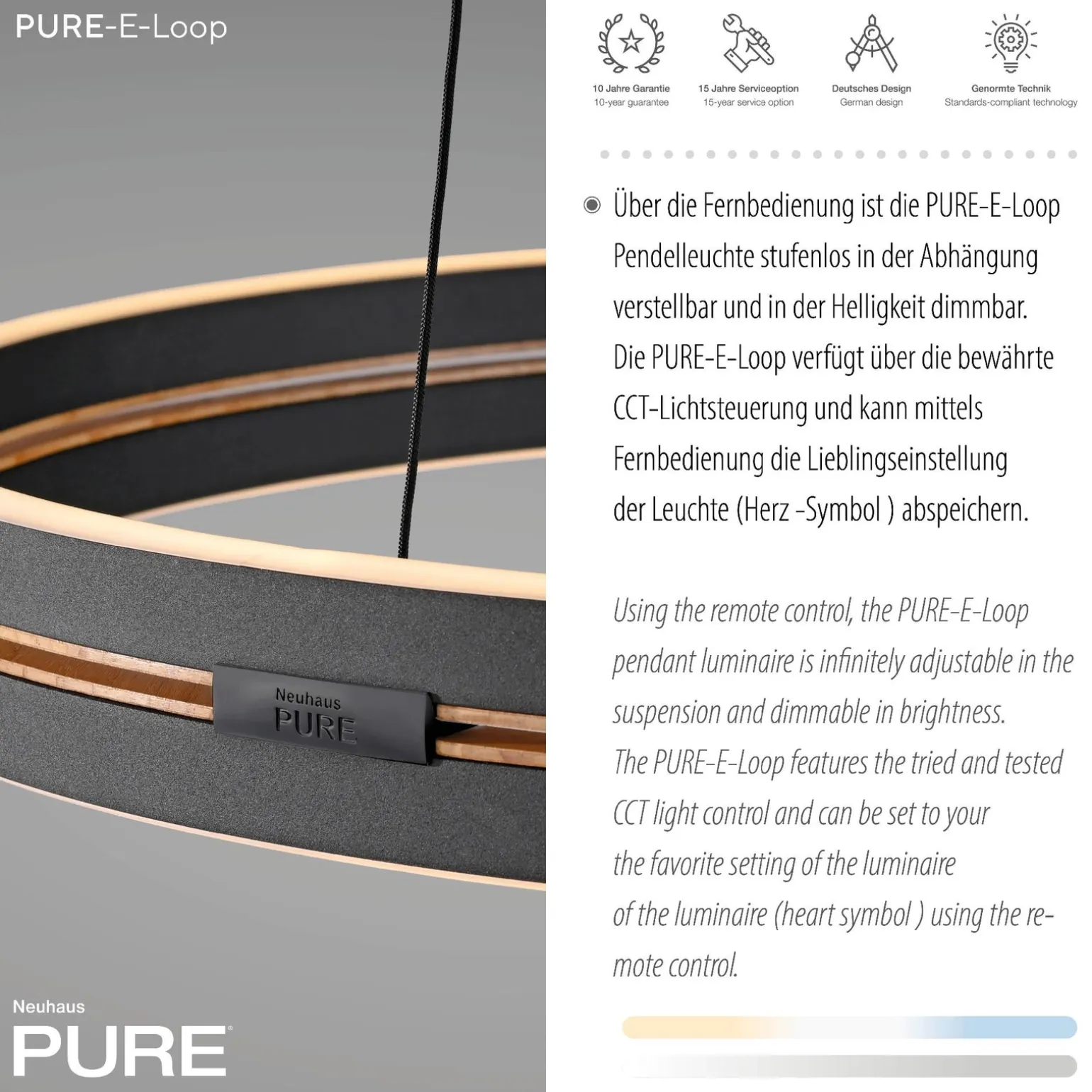 Wyróżniającym się elementem lampy PURE E-LOOP jest pilot w zestawie, który umożliwia wygodne sterowanie ustawieniami lampy z dowolnego miejsca w pomieszczeniu. Funkcja E-Lift pozwala na płynną i komfortową regulację wysokości, co sprawia, że lampa idealnie pasuje nad stół, wyspę kuchenną czy w każdym innym miejscu, gdzie potrzebujesz doskonałego oświetlenia.