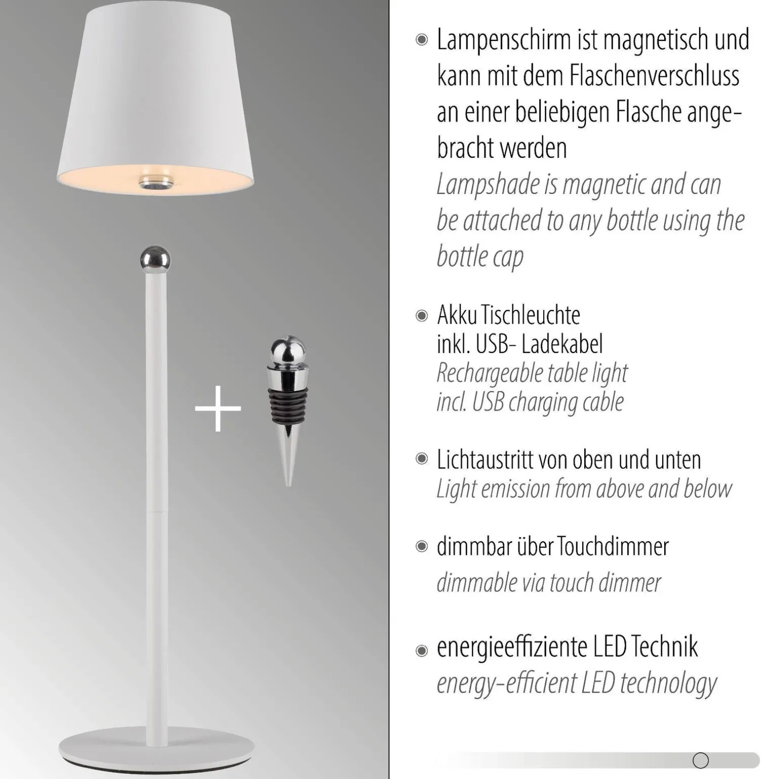 Podsumowując, przenośna lampa stołowa BOTERIA (kod produktu: 19251-16) od Paul Neuhaus to połączenie nowoczesnego designu z wysoką funkcjonalnością oraz wysokiej jakości materiałów. Jej elegancki wygląd, możliwość ładowania i ściemniania, a także odporność na warunki zewnętrzne sprawiają, że jest to produkt Premium, który z pewnością spełni oczekiwania nawet najbardziej wymagających użytkowników. Wybierz lampę BOTERIA i ciesz się niepowtarzalnym nastrojem w swoich ulubionych miejscach!
