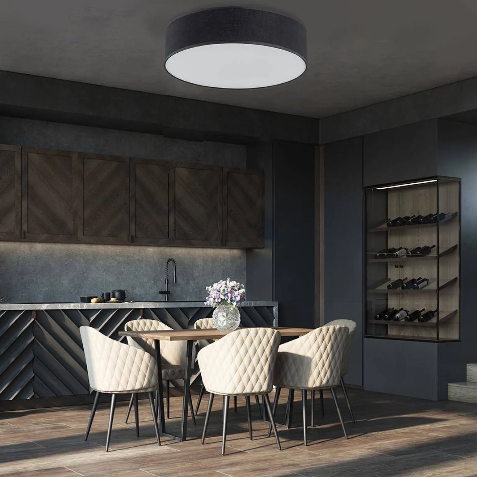 Wykonana z wysokiej jakości materiałów, w tym metalu i tworzywa sztucznego, lampa sufitowa RONDO BLACK charakteryzuje się solidną konstrukcją oraz nowoczesnym designem. Jej minimalistyczny, czarny klosz w połączeniu z białą podstawą wprowadza do wnętrza harmonię i elegancję. Dzięki metalowej oprawie, lampy sufitowe metalowe sprawiają, że oświetlenie staje się nie tylko funkcjonalne, ale i stylowe. Model ten perfekcyjnie komponuje się z różnymi stylami aranżacyjnymi, od industrialnych po skandynawskie.