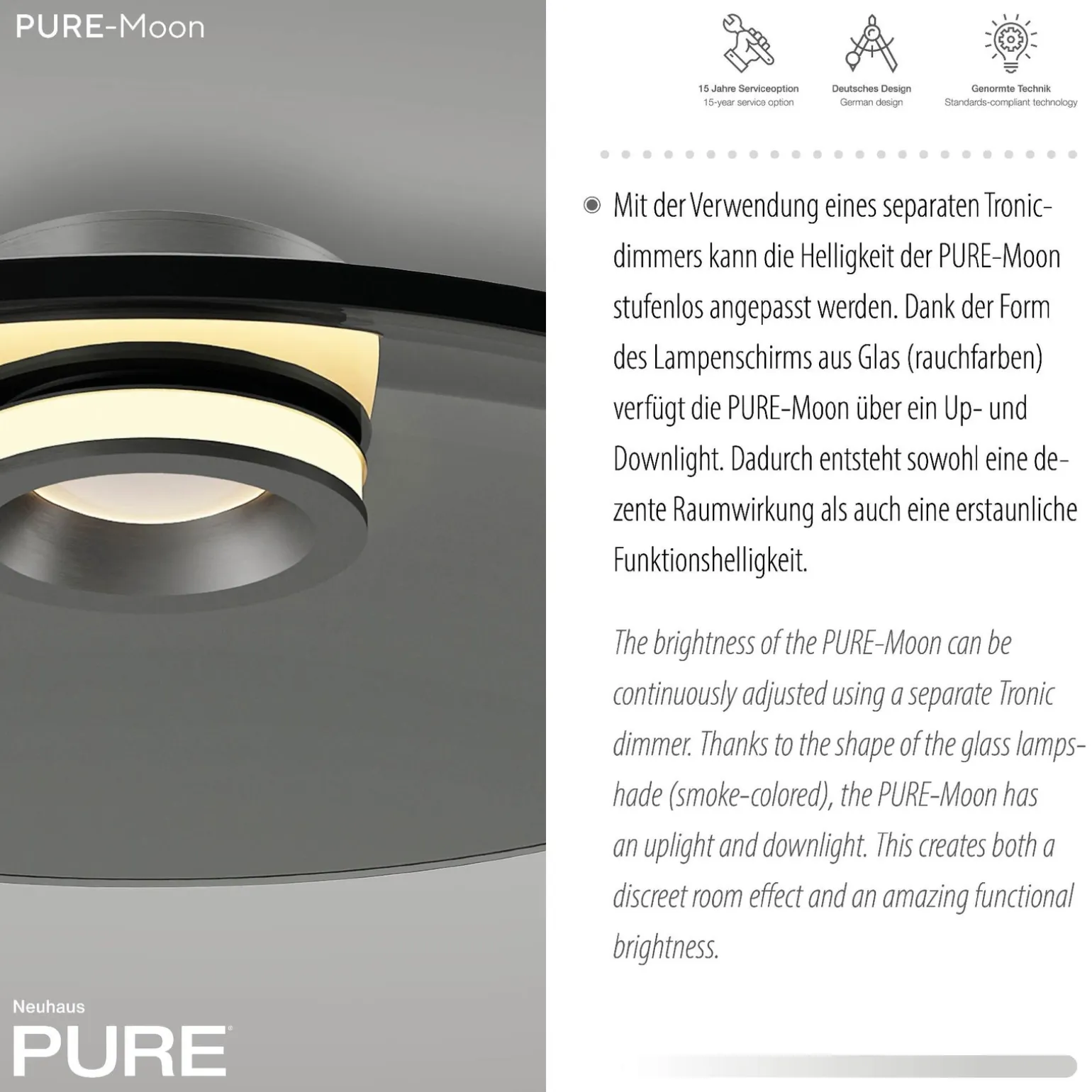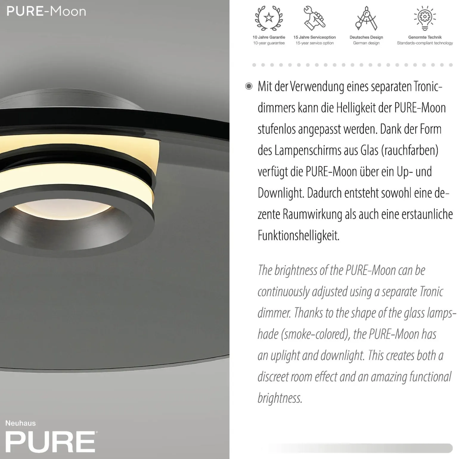 Lampa PURE MOON jest wyposażona w dwa źródła światła o łącznej mocy maksymalnej 19,5 W i wydajności 950 lumenów. Zintegrowany trzonek LED zapewnia nie tylko oszczędność energii, ale także długi okres użytkowania, co czyni ją ekologicznym wyborem. Dodatkowym atutem jest fakt, że źródło światła jest w komplecie, dzięki czemu po zakupie nie ma potrzeby szukania dodatkowych akcesoriów.