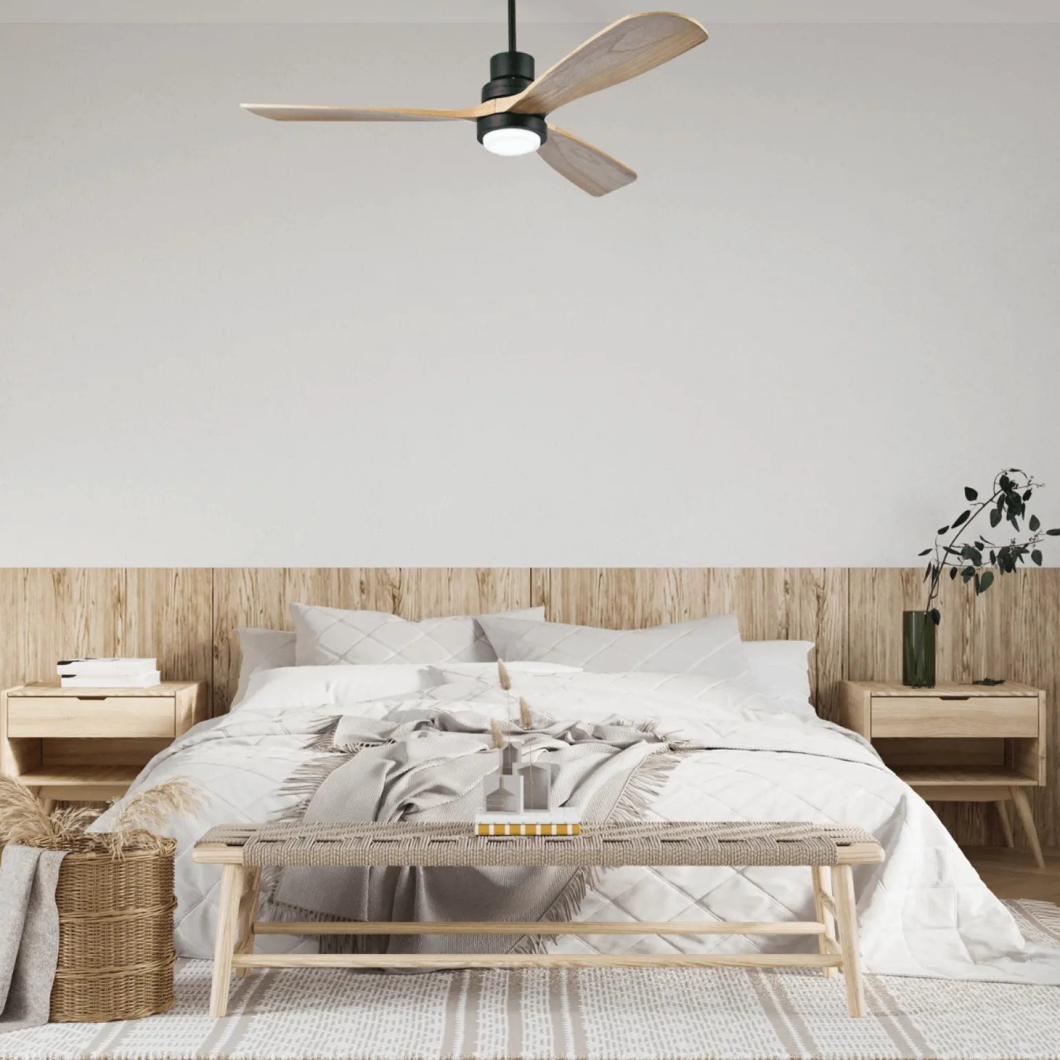 Wentylator sufitowy Zambelis charakteryzuje się unikalnym designem, który doskonale wpasuje się w każdy styl wnętrza. Wykonany z naturalnego drewna, metalu i szkła, przyciąga uwagę swoim nowoczesnym i eleganckim wyglądem. Jego ciepłe odcienie doskonale komponują się z różnymi aranżacjami przestrzeni, dodając im przytulności oraz klasy.