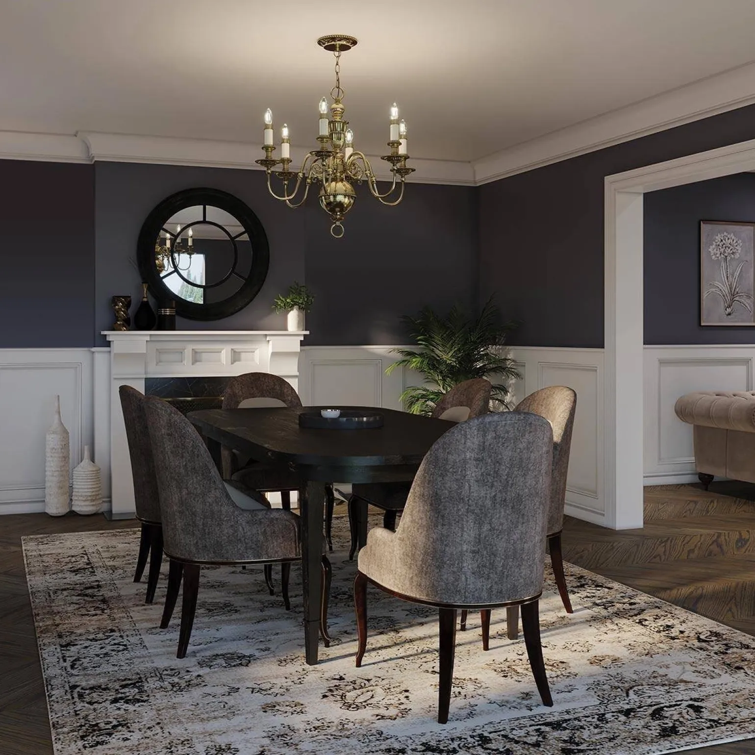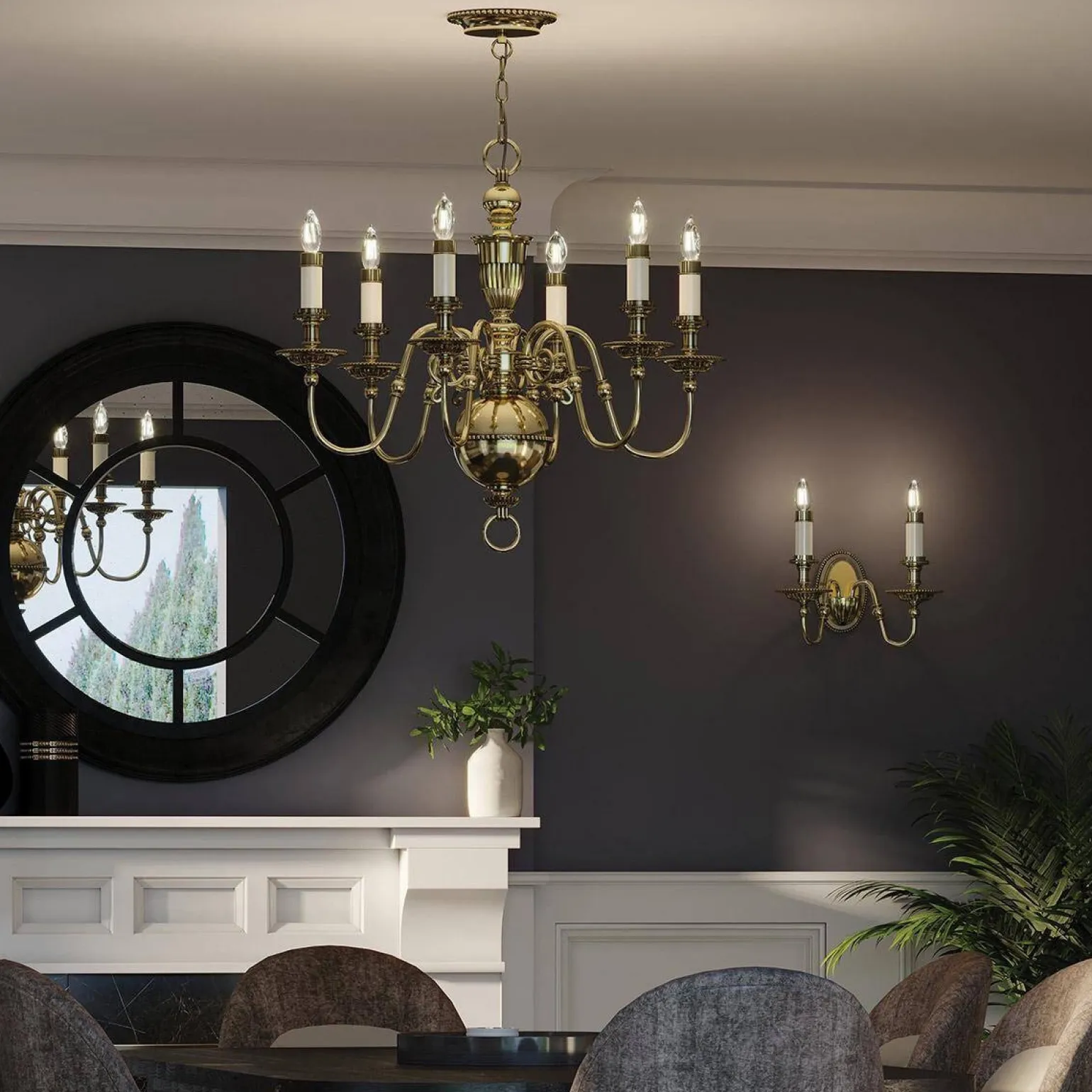 Żyrandol Cambridge marki Elstead Lighting to elegancka oprawa oświetleniowa, która idealnie wpisuje się w klasyczne i stylowe wnętrza. Model HK-CAMBRIDGE6, w kolorze mosiądzu, stanowi doskonałe uzupełnienie aranżacji jadalni, nadając jej luksusowy i przytulny charakter. Jego piękne wykończenie oraz szczegółowe detale przyciągają wzrok, czyniąc go nie tylko funkcjonalnym źródłem światła, ale także efektowną dekoracją przestrzeni.