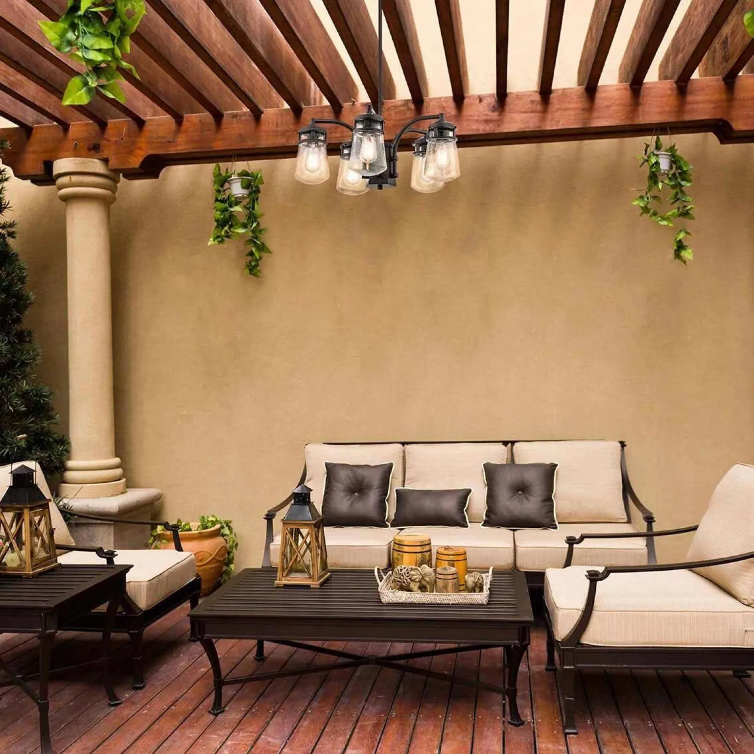 Wybierz żyrandol Lyndon (KL-LYNDON-5P-AZ) od marki Elstead Lighting i wprowadź do swojego tarasu wyjątkowy styl. Jego 5-punktowe źródło światła, elegancki design oraz praktyczność sprawią, że stanie się on centralnym punktem Twojej ogrodowej przestrzeni. Uczyń wieczory na świeżym powietrzu niezapomnianymi dzięki wyjątkowemu oświetleniu, które zachwyci nie tylko Ciebie, ale i Twoich gości!