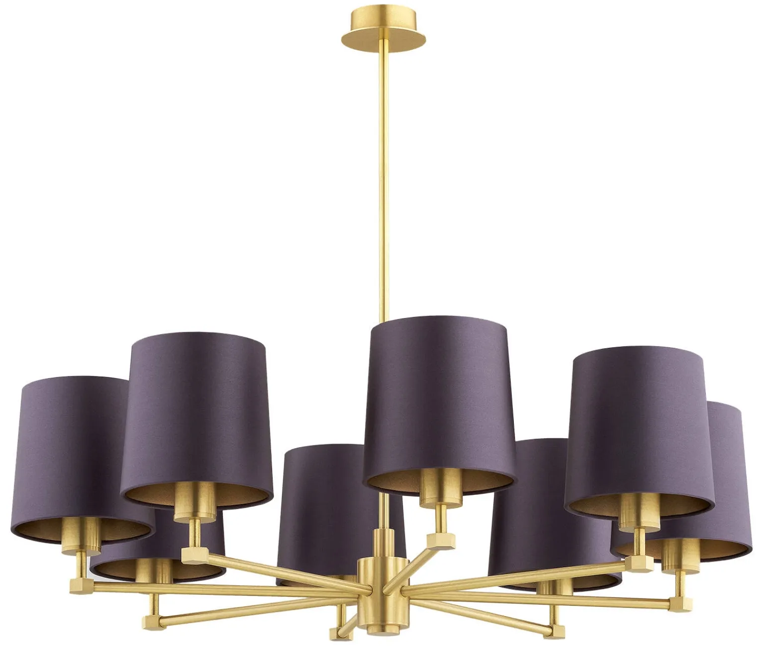 Wykonany z wysokiej jakości materiałów, żyrandol mosiężny w kolorze mosiądz oraz uzupełniony o elegancki fioletowy abażur wprowadza ciepło i przytulność do każdego pomieszczenia. Zastosowanie tkaniny w abażurze sprawia, że światło jest miękkie i przyjemne, co sprzyja relaksowi i tworzy niepowtarzalną atmosferę. Dzięki dostępnym siedmiu punktom świetlnym, żyrandole do salonu jak PRINCETON dają możliwość efektywnego oświetlenia przestrzeni, zapewniając odpowiednią jasność w każdym zakątku pokoju.