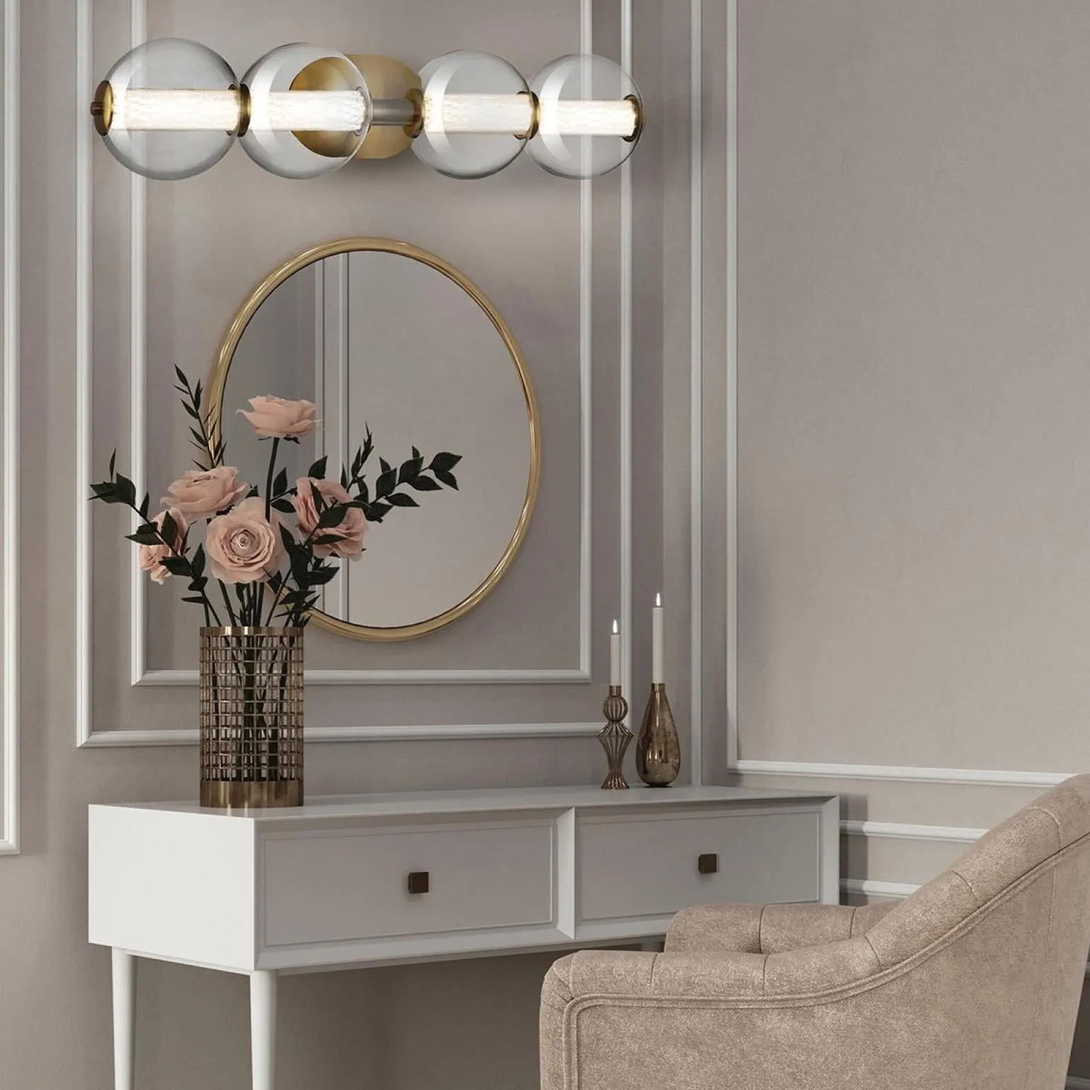 Zapraszamy do odkrycia **kinkietu Atomo** od renomowanej marki Quintiesse, model QN-ATOMO-4W-BG, który zachwyca nie tylko swoim eleganckim designem, ale również funkcjonalnością. Wykonany z najwyższej jakości materiałów, takich jak aluminium, stal oraz szkło, kinkiet łączy w sobie nowoczesność z klasycznym stylem. Jego złoty kolor w połączeniu z przezroczystym kloszem dodaje wnętrzu wyjątkowej elegancji oraz dostojeństwa.