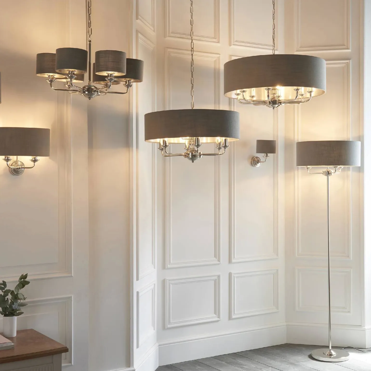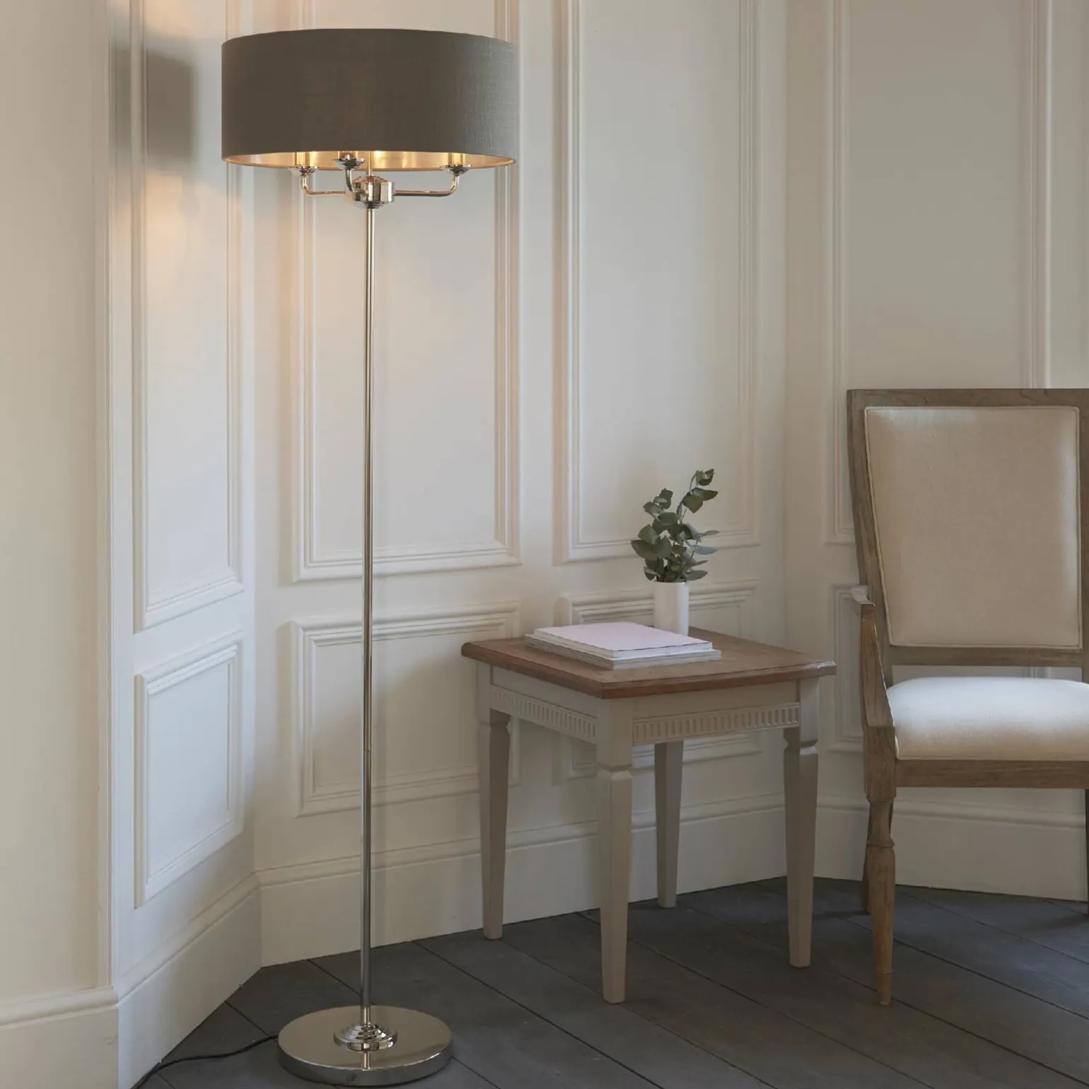 Lampa Podłogowa Highclere (94378) marki Endon to wyjątkowy element oświetleniowy, który doskonale wpasuje się w stylowe wnętrza, szczególnie w aranżacji salonów. Jej retro styl przyciąga wzrok i nadaje przestrzeni elegancji oraz klasy. Wykonana z wysokiej jakości materiałów, lampka łączy w sobie niklowane wykończenie z jasną płytą, która harmonijnie współgra z tkaniną węglową abażura, tworząc spójną i estetyczną całość.