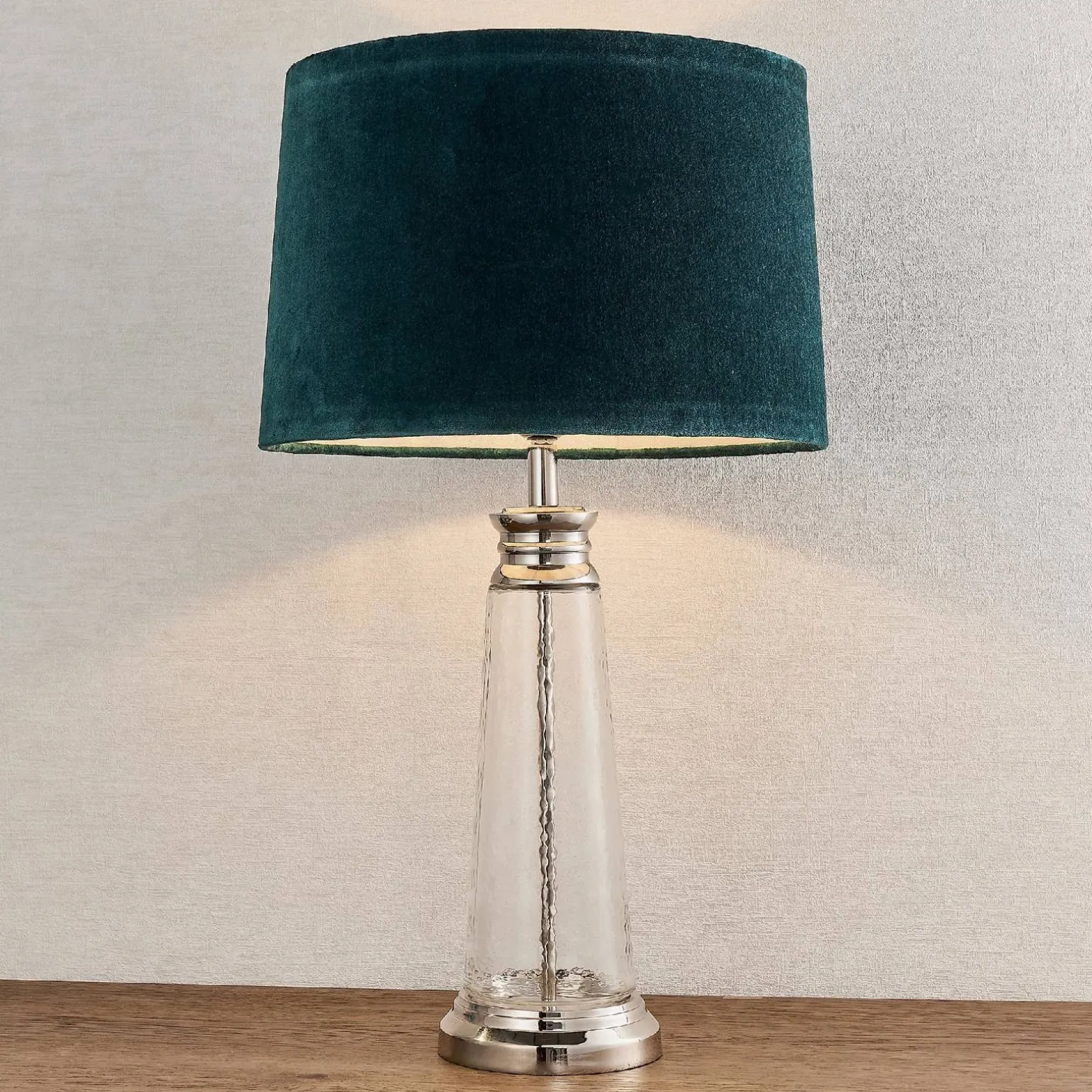 Lampa Stołowa Winslet (90545) od marki Endon to niezwykły element, który doskonale wpisuje się w nowoczesne aranżacje wnętrz. Charakteryzuje się wykończeniem z bezbarwnego młotkowanego szkła oraz turkusowym aksamitem, co nadaje jej elegancki i stylowy wygląd. Idealnie sprawdzi się jako lampka na komodę, wprowadzając do Twojego salonu niepowtarzalny klimat. Jej unikalny design przyciąga wzrok i podkreśla charakter pomieszczenia, dlatego jest doskonałym wyborem dla osób, które cenią sobie estetykę i funkcjonalność.