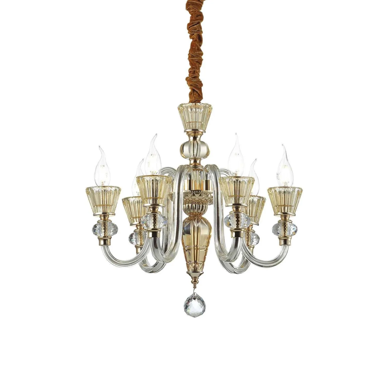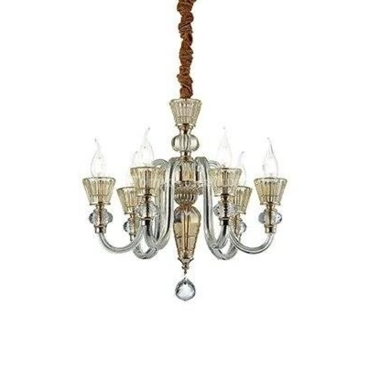 Warto zwrócić uwagę na zastosowane materiały, z których została wykonana ta lampa. Metal oraz szkło w odcieniach srebrnym, złotym i bursztynowym oddają klasyczny charakter żyrandola, a jednocześnie wpisują się w aktualne trendy w aranżacji wnętrz. To idealne rozwiązanie dla tych, którzy cenią sobie klasyczne akcenty oraz eleganckie detale w swojego otoczeniu.