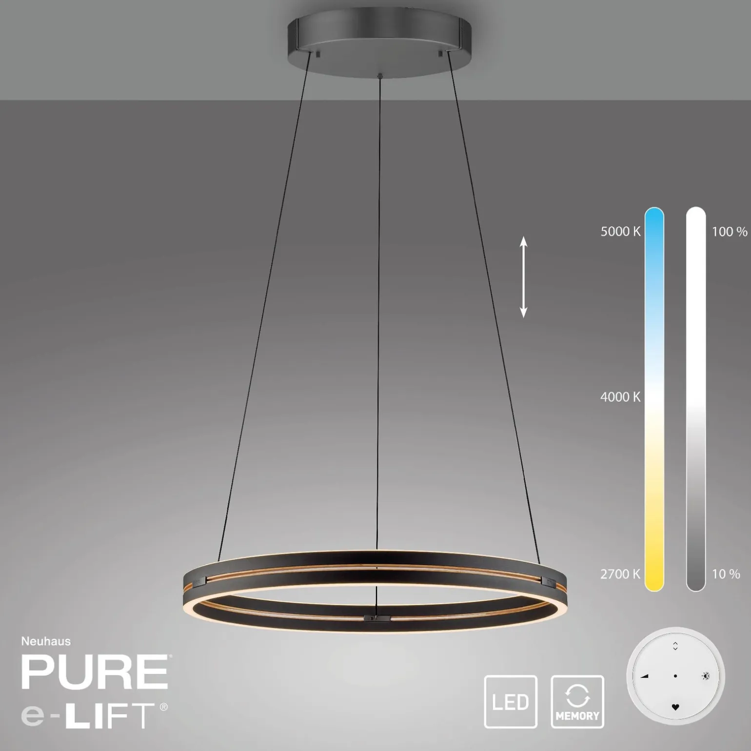 Wyróżniającym się elementem lampy PURE E-LOOP jest pilot w zestawie, który umożliwia wygodne sterowanie ustawieniami lampy z dowolnego miejsca w pomieszczeniu. Funkcja E-Lift pozwala na płynną i komfortową regulację wysokości, co sprawia, że lampa idealnie pasuje nad stół, wyspę kuchenną czy w każdym innym miejscu, gdzie potrzebujesz doskonałego oświetlenia.