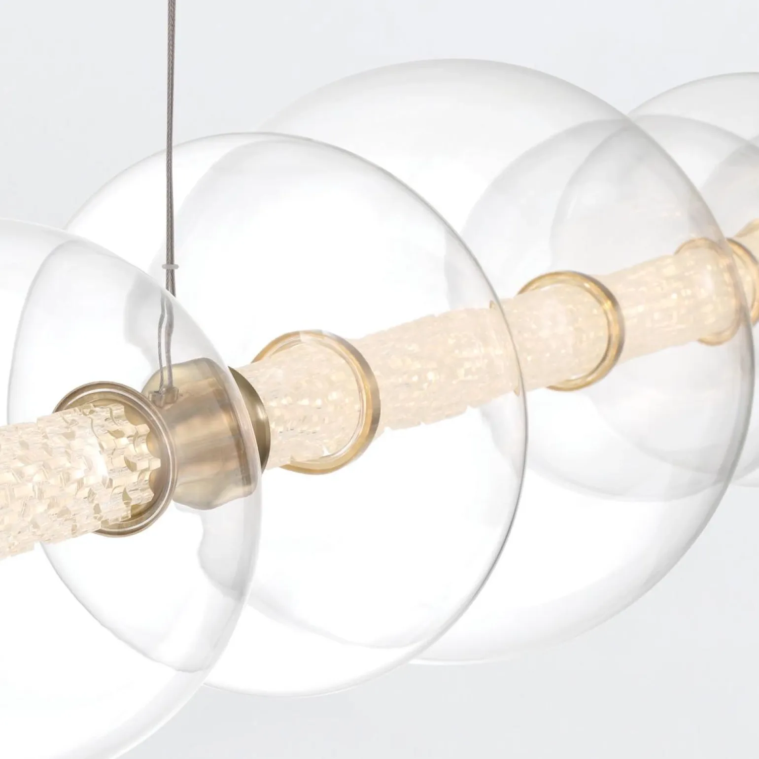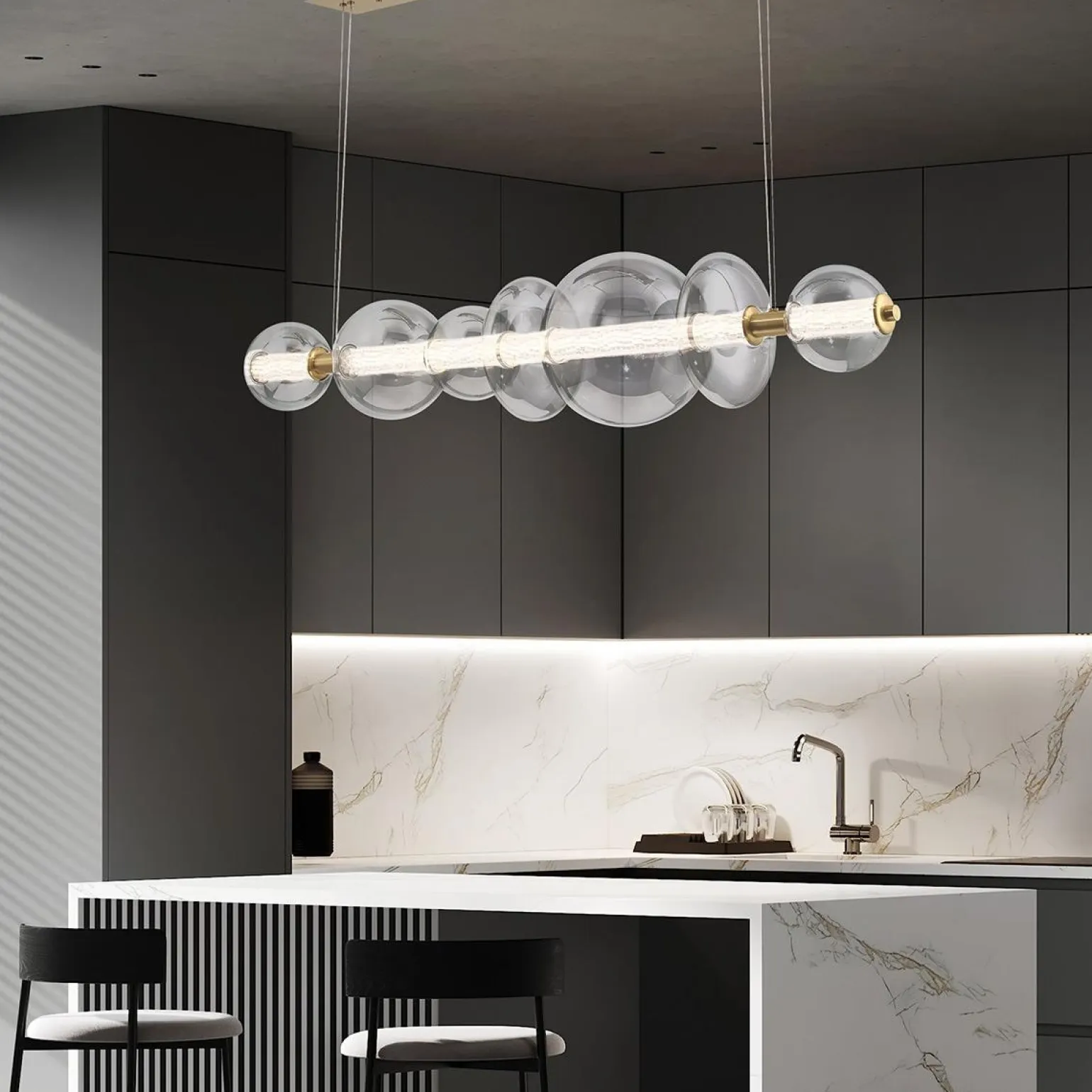 Lampa wyspowa Atomo marki Quintiesse to połączenie nowoczesności i elegancji, które wprowadzi wyjątkowy klimat do każdego wnętrza. Dzięki 7 źródłom światła, ta lampa dostarcza aż 3586 lumenów, co sprawia, że idealnie oświetli kuchnię lub jadalnię. Doskonałe wykończenie w szczotkowanym złocie oraz przezroczysty klosz wprowadza do wnętrza odrobinę glamour, a jednocześnie harmonijnie wpisuje się w trend modern classic.