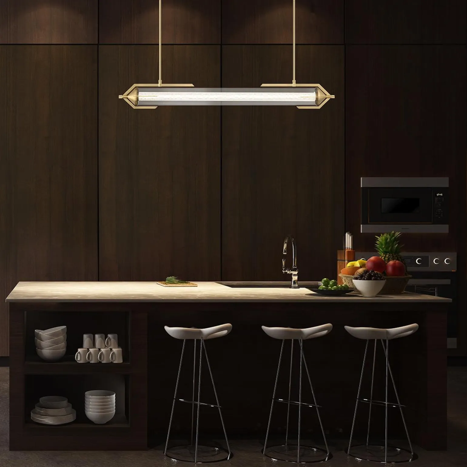 Jednym z najważniejszych atutów lampy Espada jest jej oświetlenie. Zastosowany zintegrowany trzonek LED o maksymalnej mocy 38W generuje imponującą ilość 3329 lumenów przy przyjemnej temperaturze barwy światła wynoszącej 3000K. Dzięki temu, lampa nie tylko efektywnie oświetli stół czy wyspę, ale również stworzy ciepłą i przyjazną atmosferę w każdym pomieszczeniu.