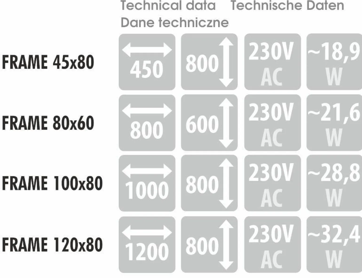 Sprawdzając parametry techniczne, warto zwrócić uwagę na napięcie zasilania, które wynosi 230 V. To standardowe napięcie zapewnia kompatybilność z większością instalacji elektrycznych, co ułatwia montaż i użytkowanie lustra. Dzięki temu, lustro FRAME może być bez problemu zamontowane w każdym domu czy mieszkaniu.