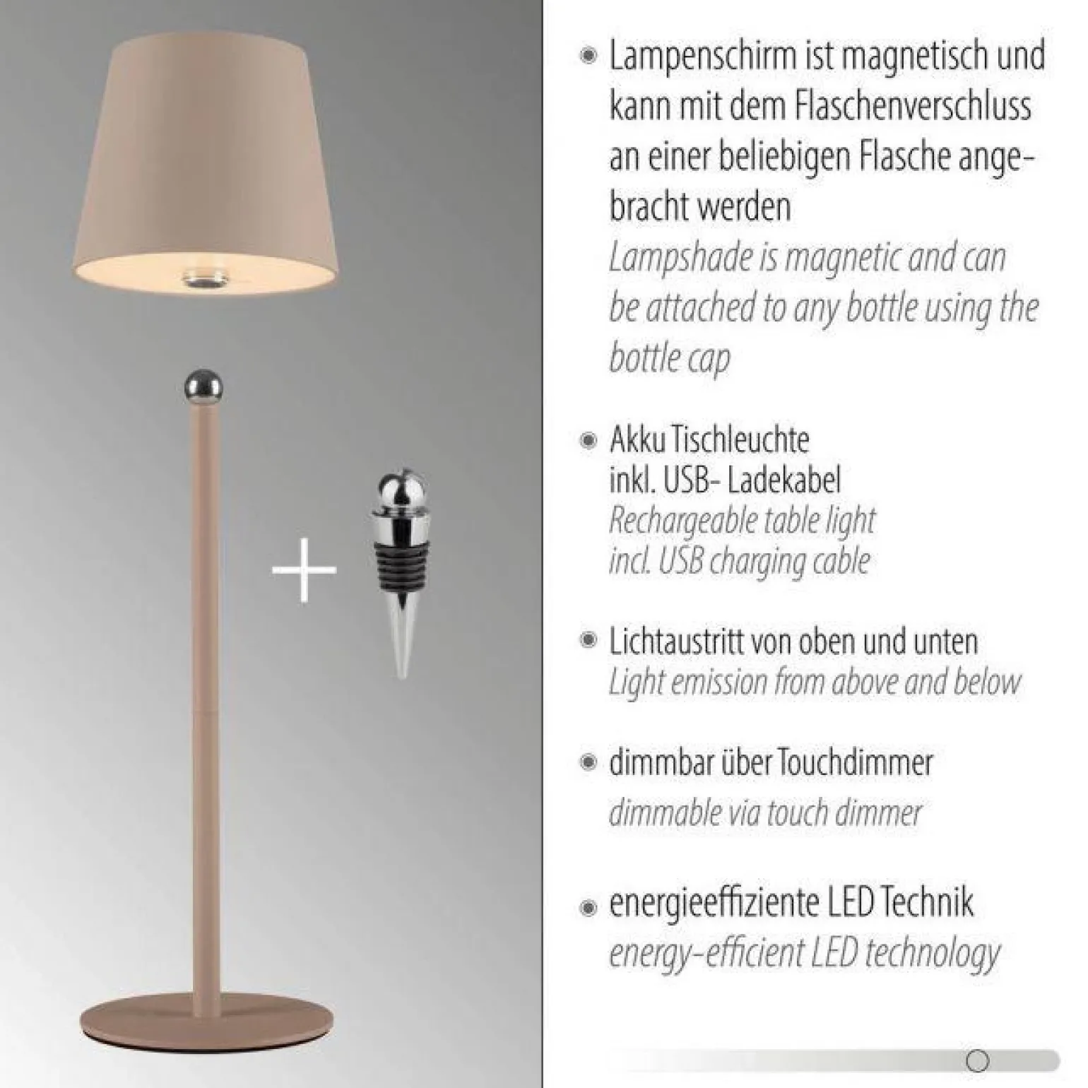 Przenośna lampa stołowa BOTERIA PIASKOWY (19251-39) od marki Paul Neuhaus to wyjątkowy element oświetlenia, który harmonijnie łączy funkcjonalność z nowoczesnym designem. Dzięki swojej eleganckiej beżowej barwie, ta lampa doskonale wpasuje się w każde wnętrze, wzbogacając atmosferę zarówno w pomieszczeniach, jak i na świeżym powietrzu. Przy jej pomocy stworzysz intymny oraz przytulny klimat, idealny na romantyczne wieczory czy spotkania z przyjaciółmi.