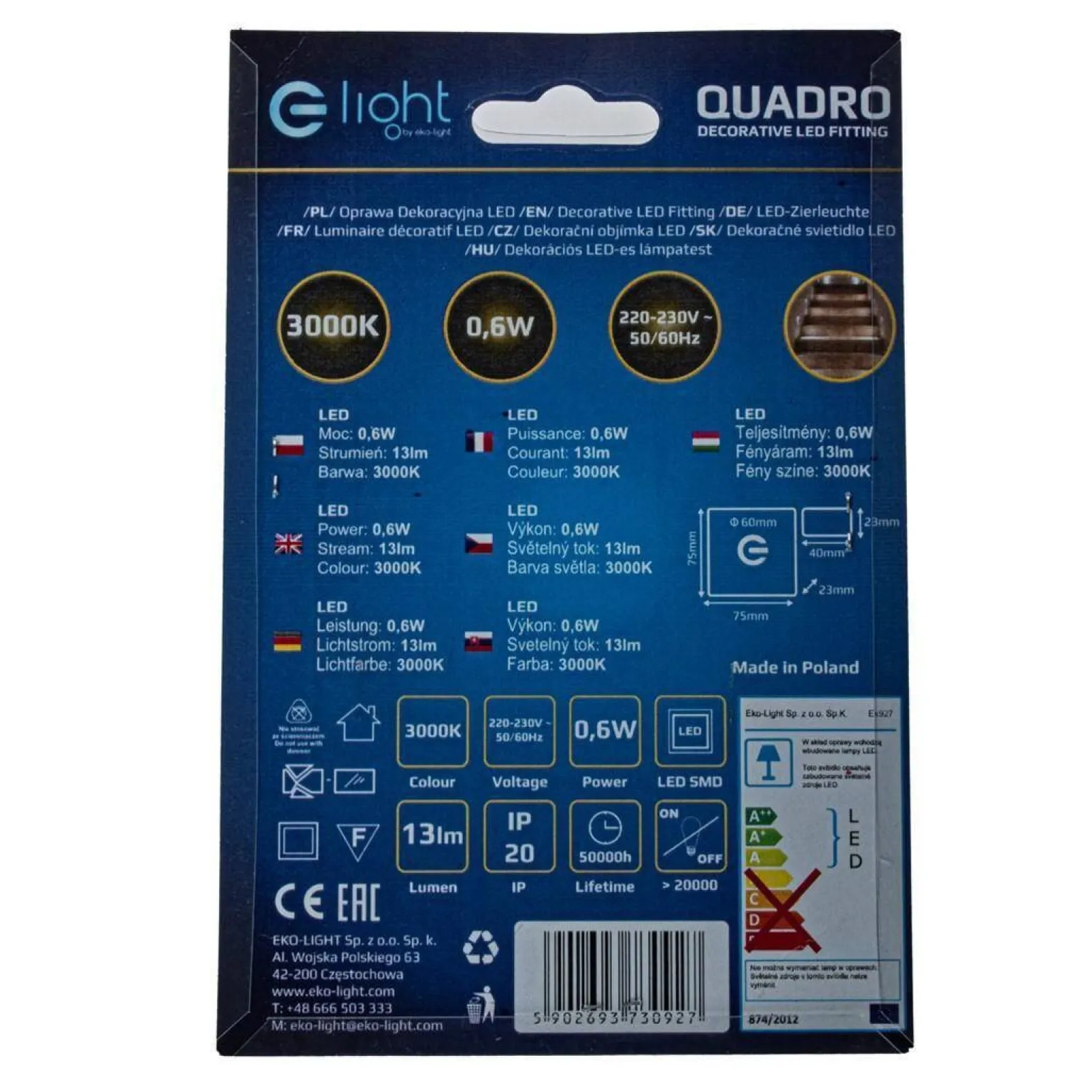 QUADRO Barwa Ciepła 3000K (EKS0927) marki Eko-Light to idealne rozwiązanie do oświetlenia wnętrz, które doskonale sprawdzi się w takich pomieszczeniach jak schody czy korytarz. Dzięki ciepłej barwie światła o temperaturze 3000K, wprowadza przytulną atmosferę, która sprzyja relaksowi i komfortowi. Oprawa wykonana jest z materiałów wysokiej jakości, takich jak tworzywo sztuczne oraz aluminium, co gwarantuje jej trwałość oraz estetykę.