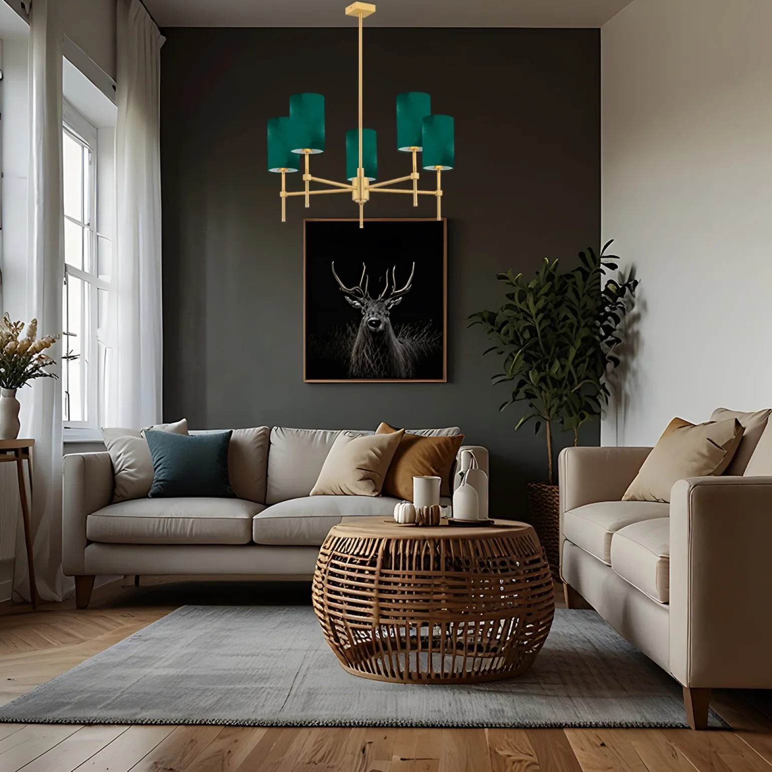 Zastosowany w żyrandolu z abażurem materiał tkaninowy w zielonym odcieniu w połączeniu z mosiężnymi elementami sprawia, że lampa ta staje się centralnym punktem w każdym wnętrzu. Niezależnie od tego, czy zdecydujemy się na umieszczenie jej w salonie, czy też w jadalni, jej obecność z pewnością uzupełni aranżację, tworząc przytulną i elegancką atmosferę. Żyrandole vintage są synonimem dobrego smaku i ponadczasowej elegancji.