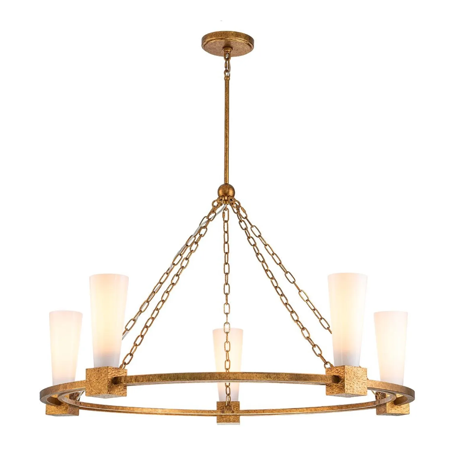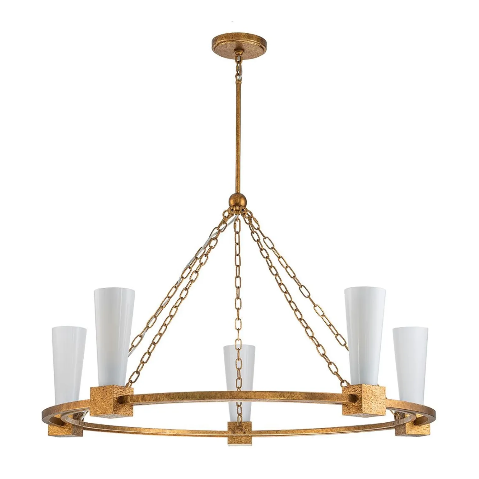 Żyrandol Kristy marki Elstead Lighting to doskonałe połączenie elegancji i stylu retro, które doda wyjątkowego charakteru każdemu wnętrzu. Z pięcioma źródłami światła, ten efektowny żyrandol wykonany z wysokiej jakości stali oraz opalowego szkła, zapewnia nie tylko doskonałe oświetlenie, ale również stanowi wspaniałą dekorację. Jego kolor w odcieniu przecieranego złota nadaje mu unikalny urok i sprawia, że idealnie komponuje się w różnych aranżacjach, zarówno w salonie, jak i jadalni.